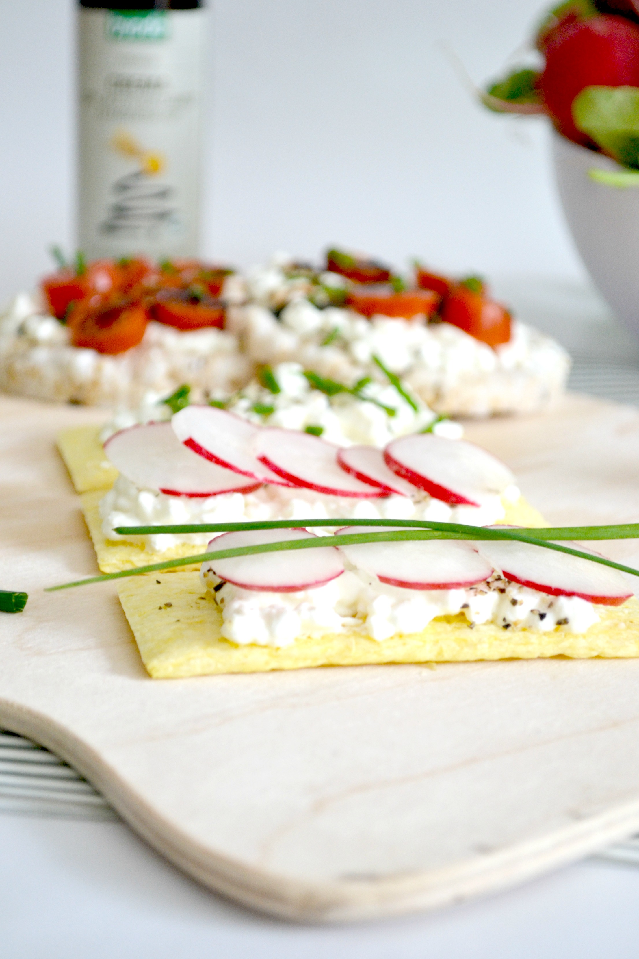 Wie dem auch sei, bestreicht einfach die Reiswaffeln und/oder das Knusperbrot mit dem Hüttenkäse und belegt diese dann wie ihr wollt. Entweder nur mit Schnittlauch, mit Tomate und Schnittlauch oder oder oder, ganz so, wie es EUCH mundet. Alles mit Salz und Pfeffer leicht bestreuen und die Creme, zumindest bei den Tomaten, drüber träufeln lassen und innerhalb von kurzen Augenblicken habt ihr ein super leckeres Frühstück! Leicht, erfrischend, köstlich! Mehr kann man sich doch gar nicht wünschen oder? Und wenn es besonders heiß ist, finde ich es auch besonders köstlich. Es liegt nicht schwer im Magen und man wird dennoch satt!