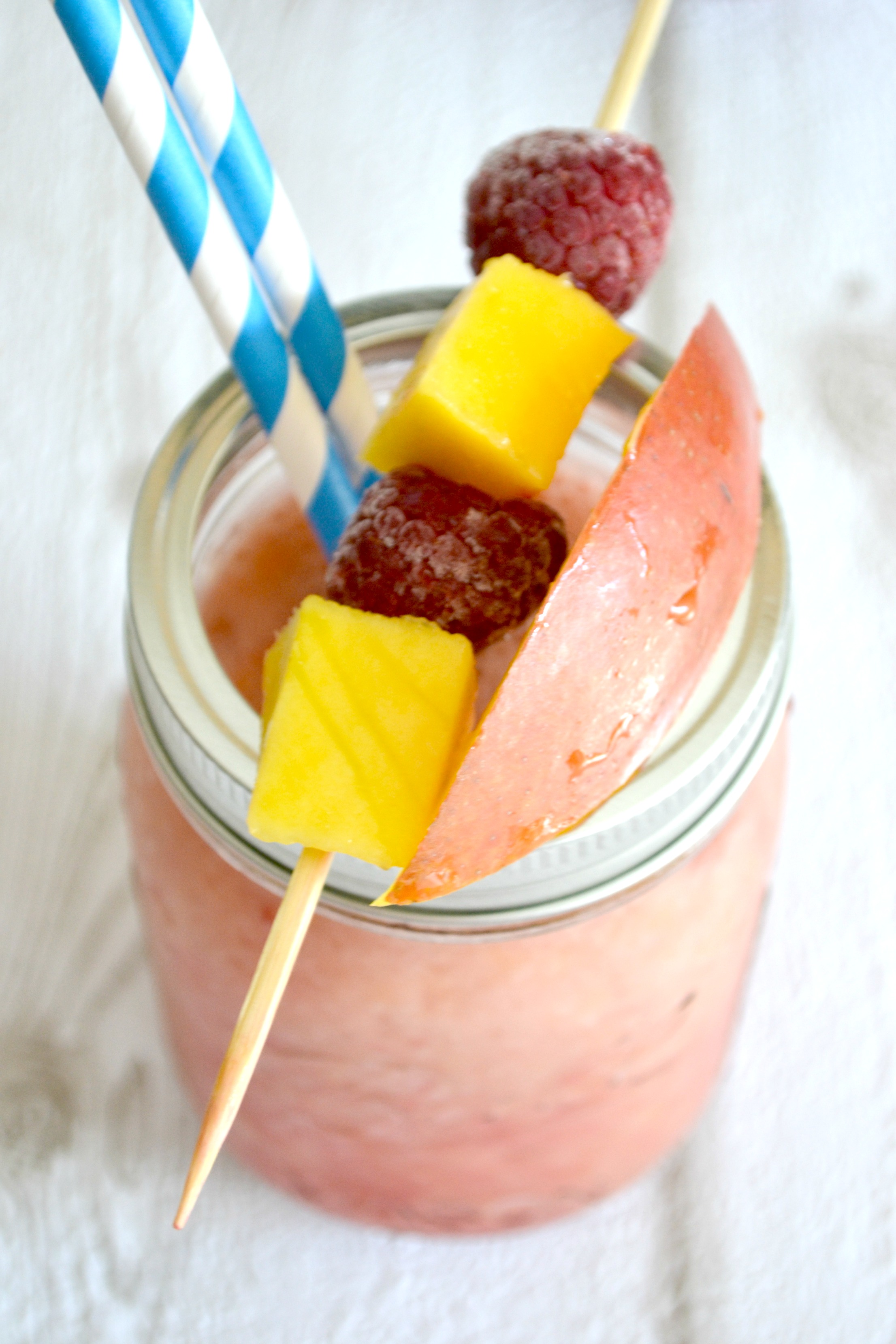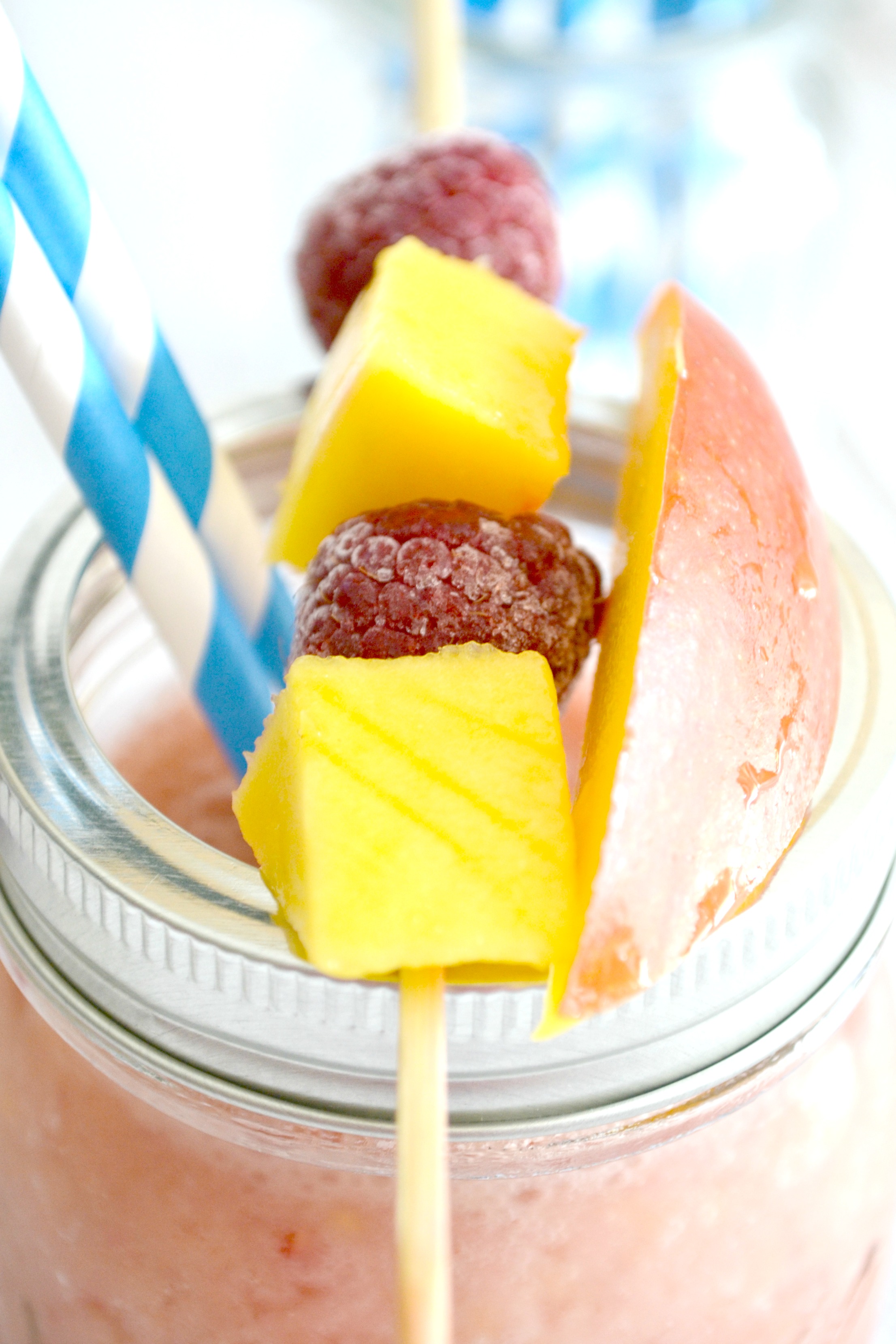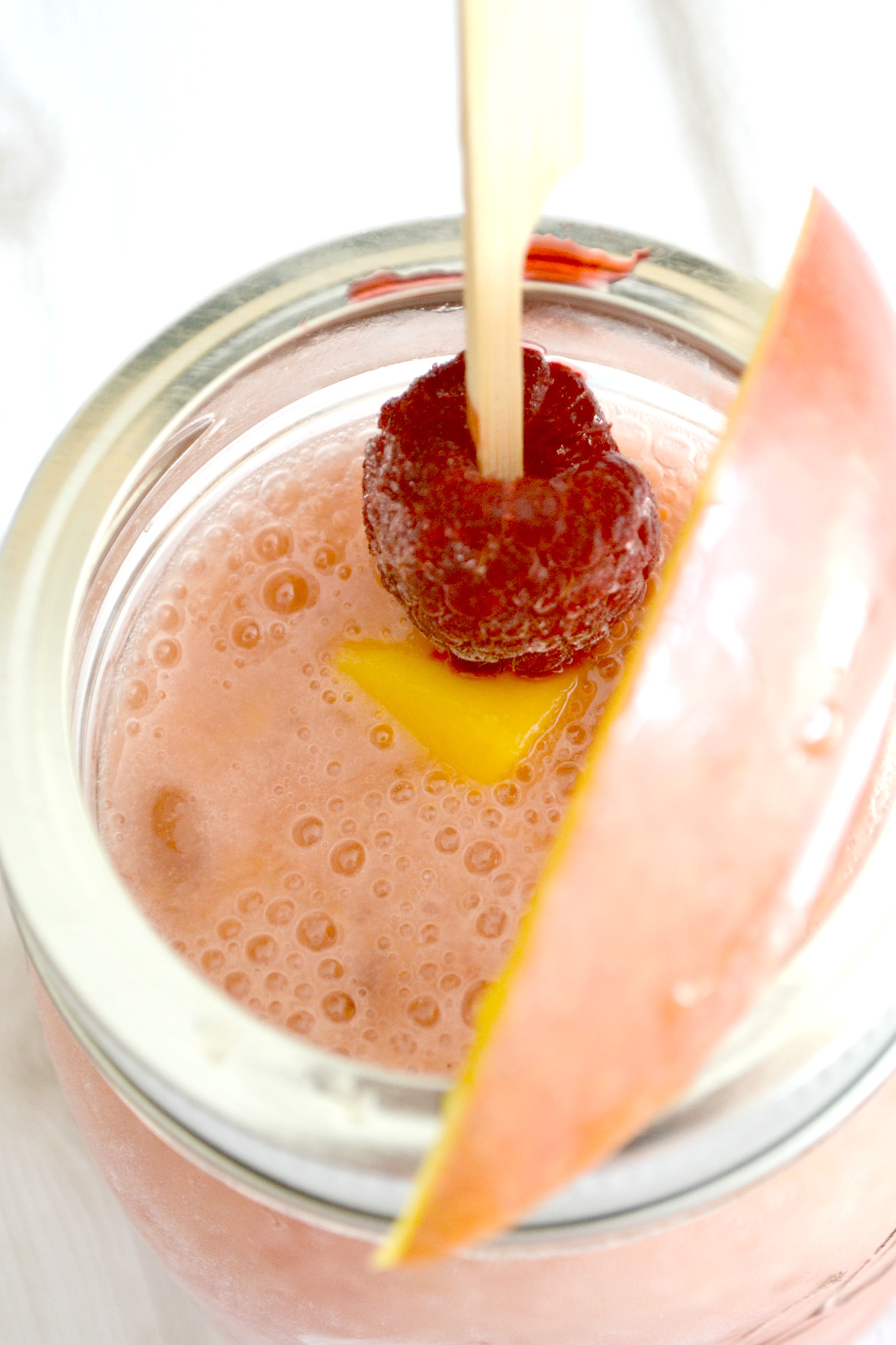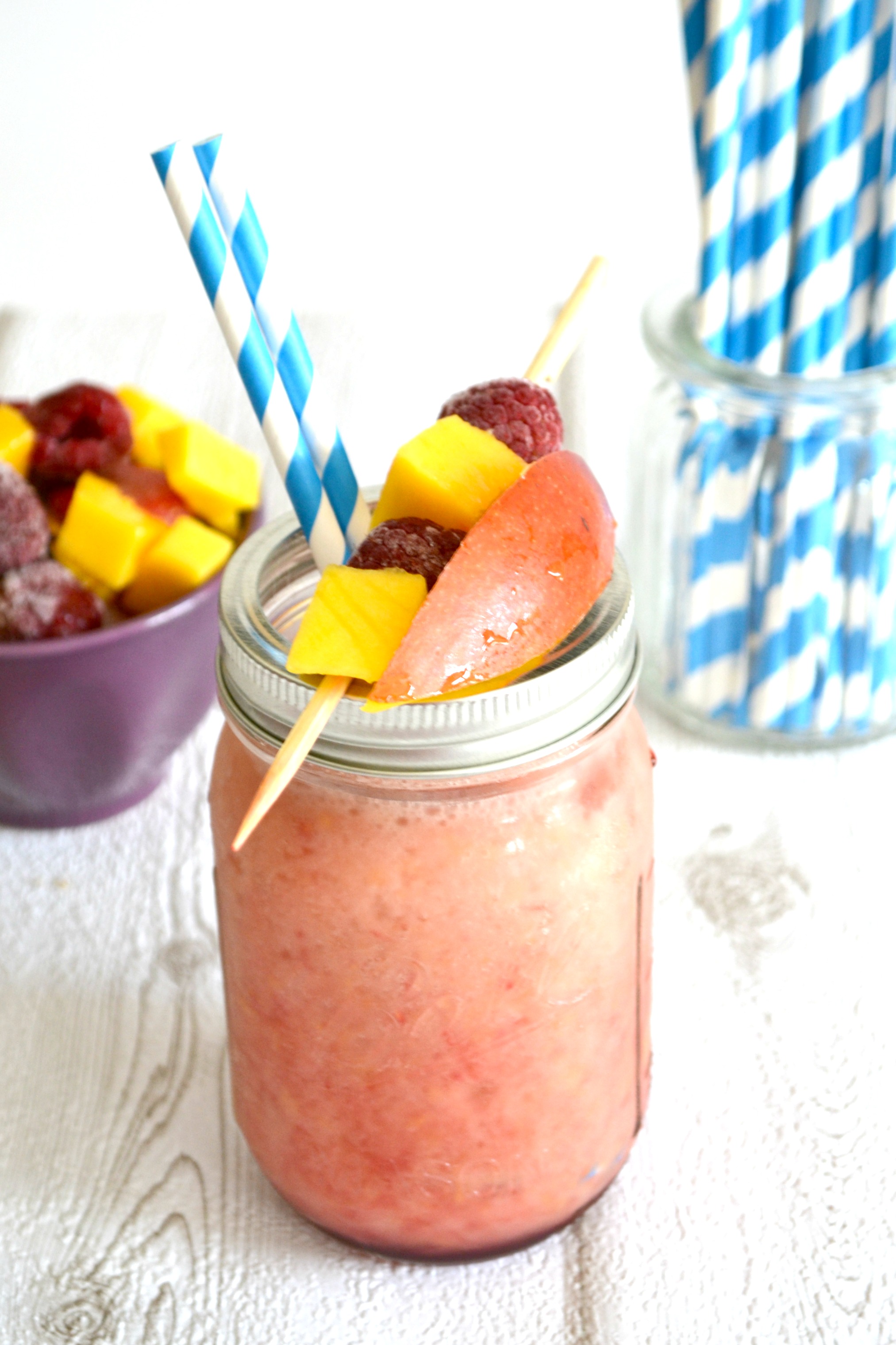 Schneidet die Mango in ganz kleine Stückchen und gebt sie zusammen mit den TK-Himbeeren in ein hohes Gefäß. Nun noch ein paar Eiswürfel drauf, etwa 2 EL Himbeersirup und so viel Kokosnussdrink bis alles etwa zwei Finger breit bedeckt ist. Mixt es bis die Früchte püriert, die Eiswürfel aber noch stückig sind. Mit frischem Obst garnieren, in einem schönes Glas servieren und genießen.