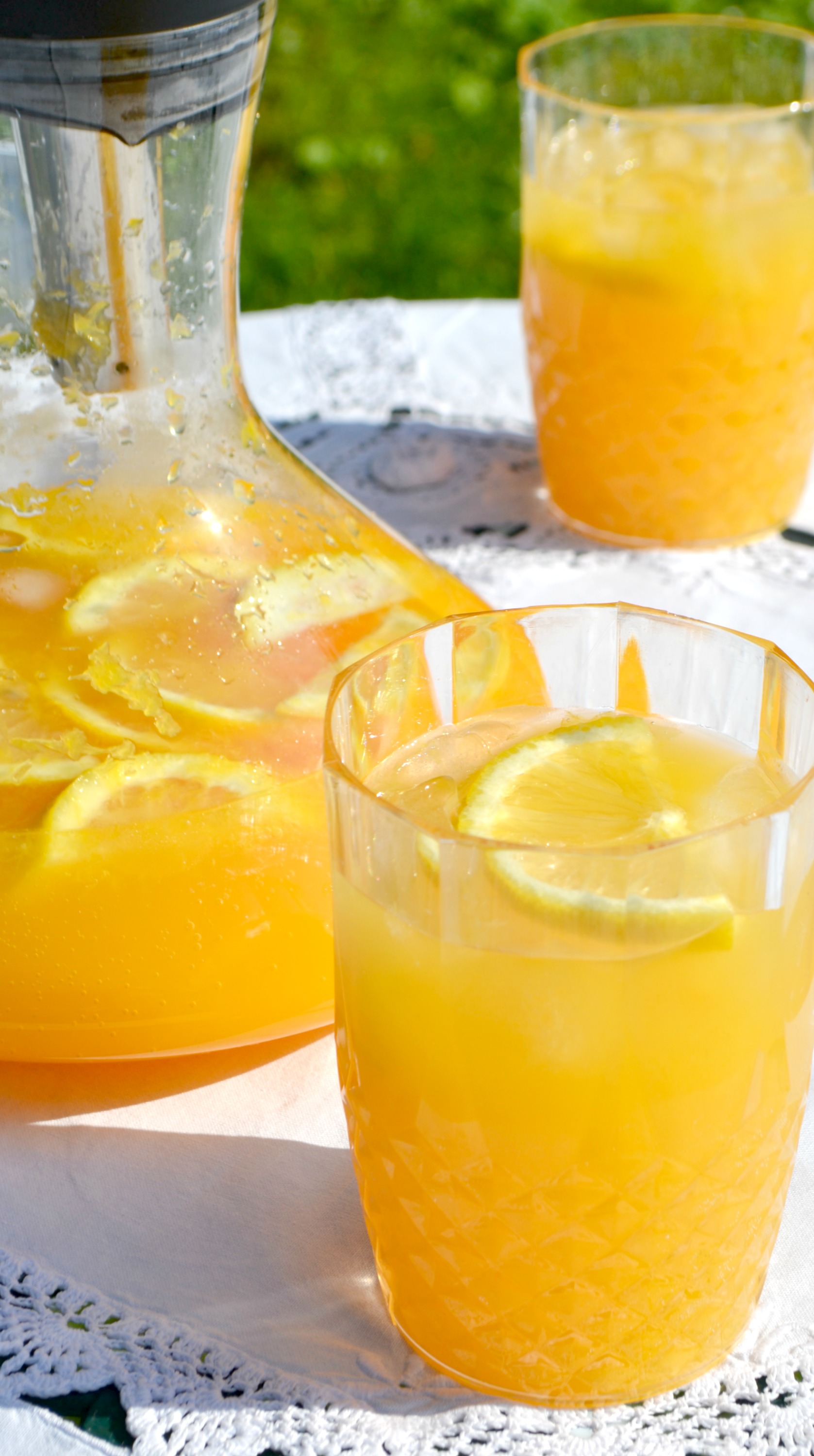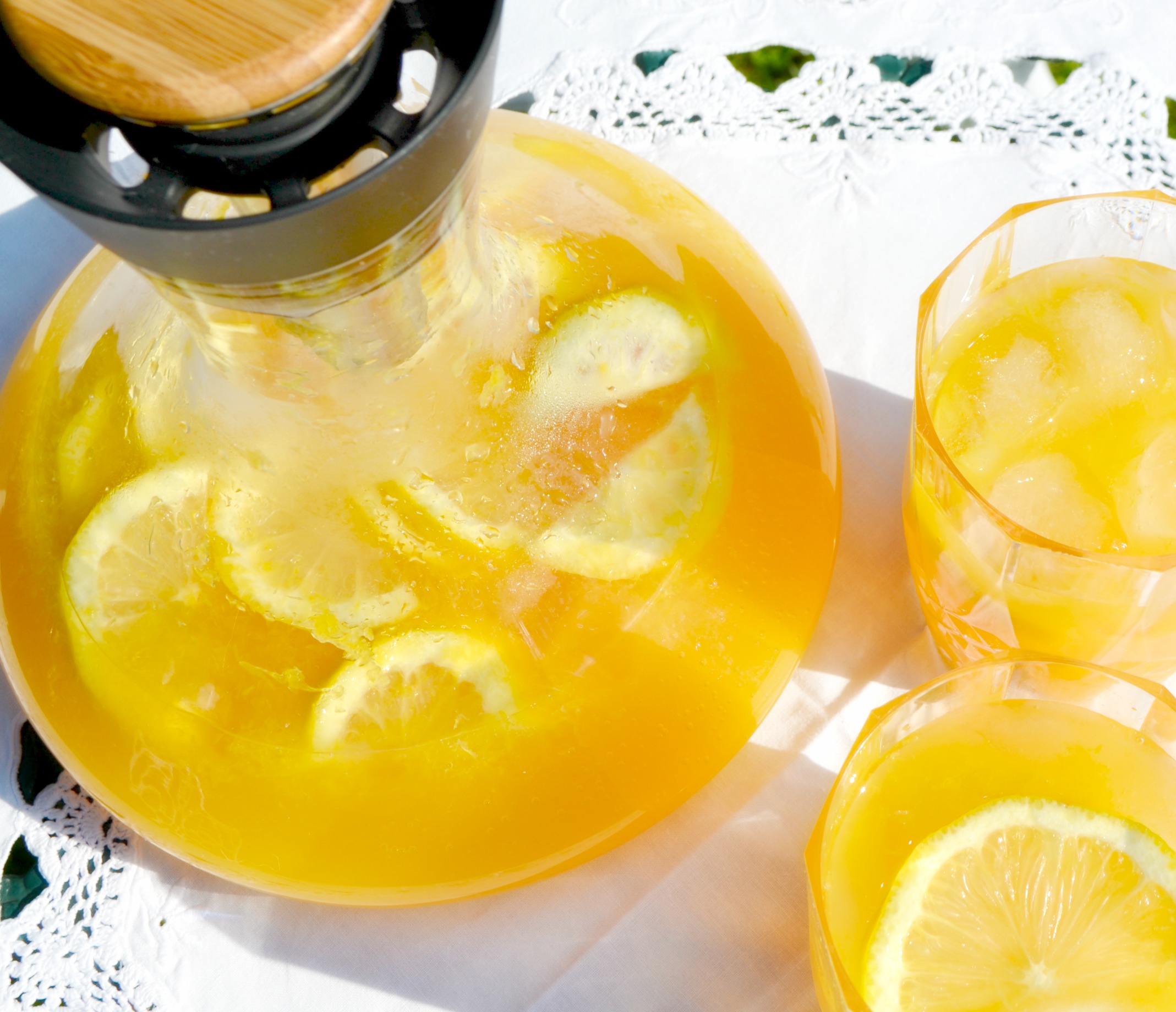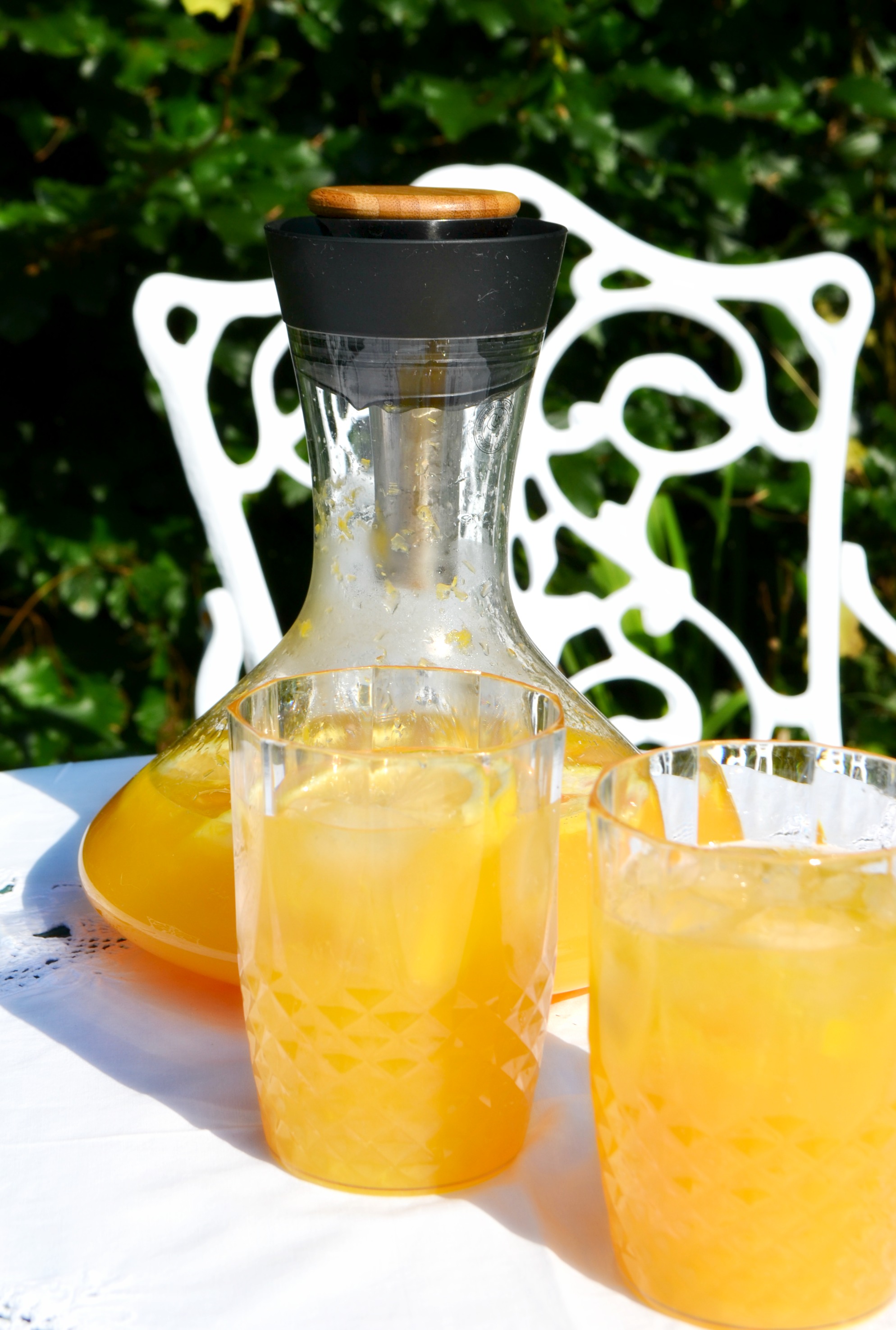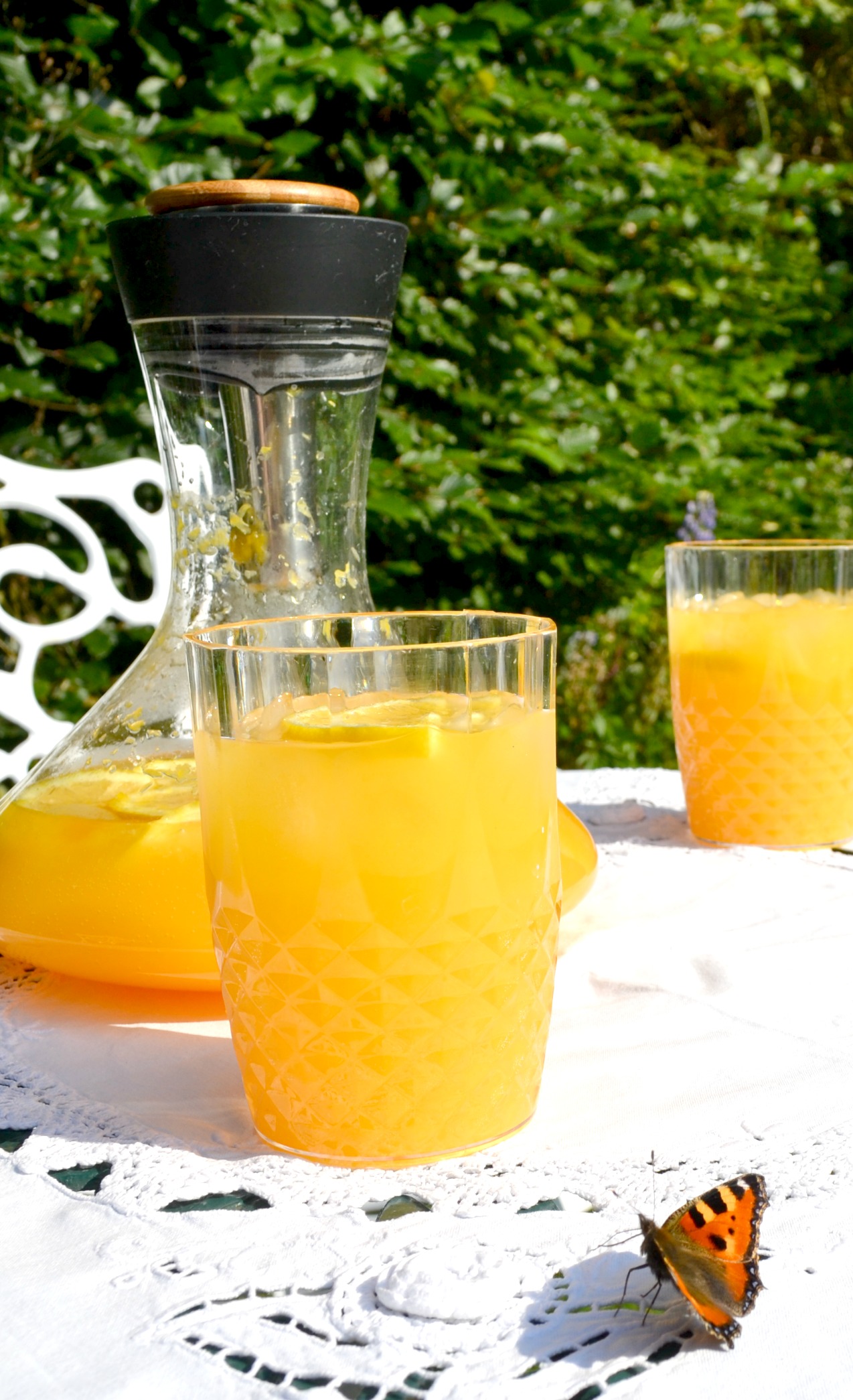 So, genug aufgeregt, kommen wir zur heutigen Juicyday-Erfrischung: Selfmade Orangen-Mandarinen-Limonade und dem Geständnis, dass ich es schon wieder tat. Was ich abermals tat? Na, eine Weinkaraffe nicht für diesen, sondern für eine Limonade zu ‚missbrauchen‘. Sie ist jedoch so herrlich toll und man bekommt die Fruchtschnitzel so klasse hinein, dass ich einfach nicht anders konnte.