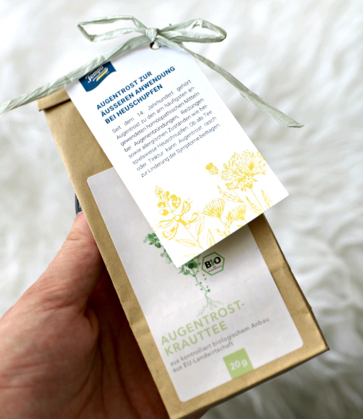 - Eine Augentrost-Tee-Mischung zum Zubereiten mit Anleitung und Demak’Up Wattepads zum Auftragen
