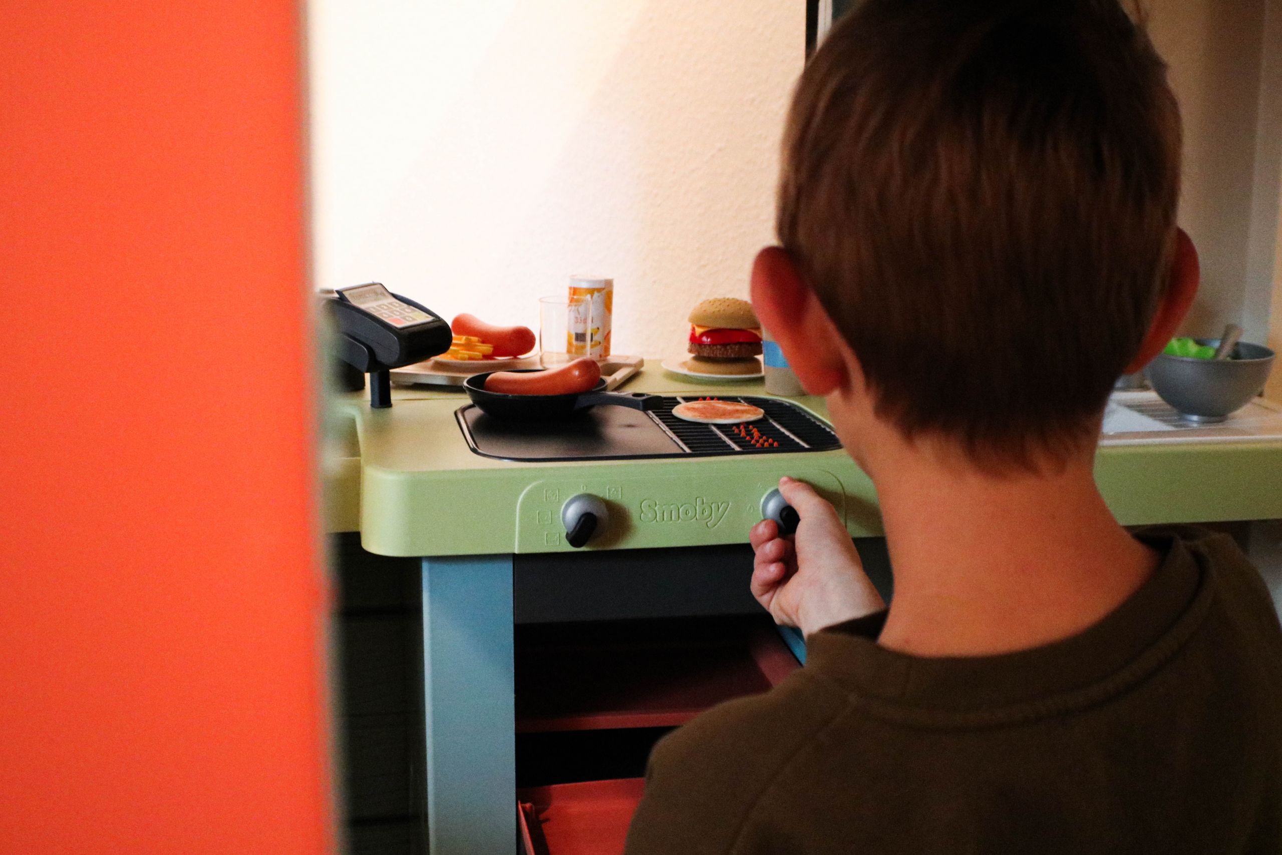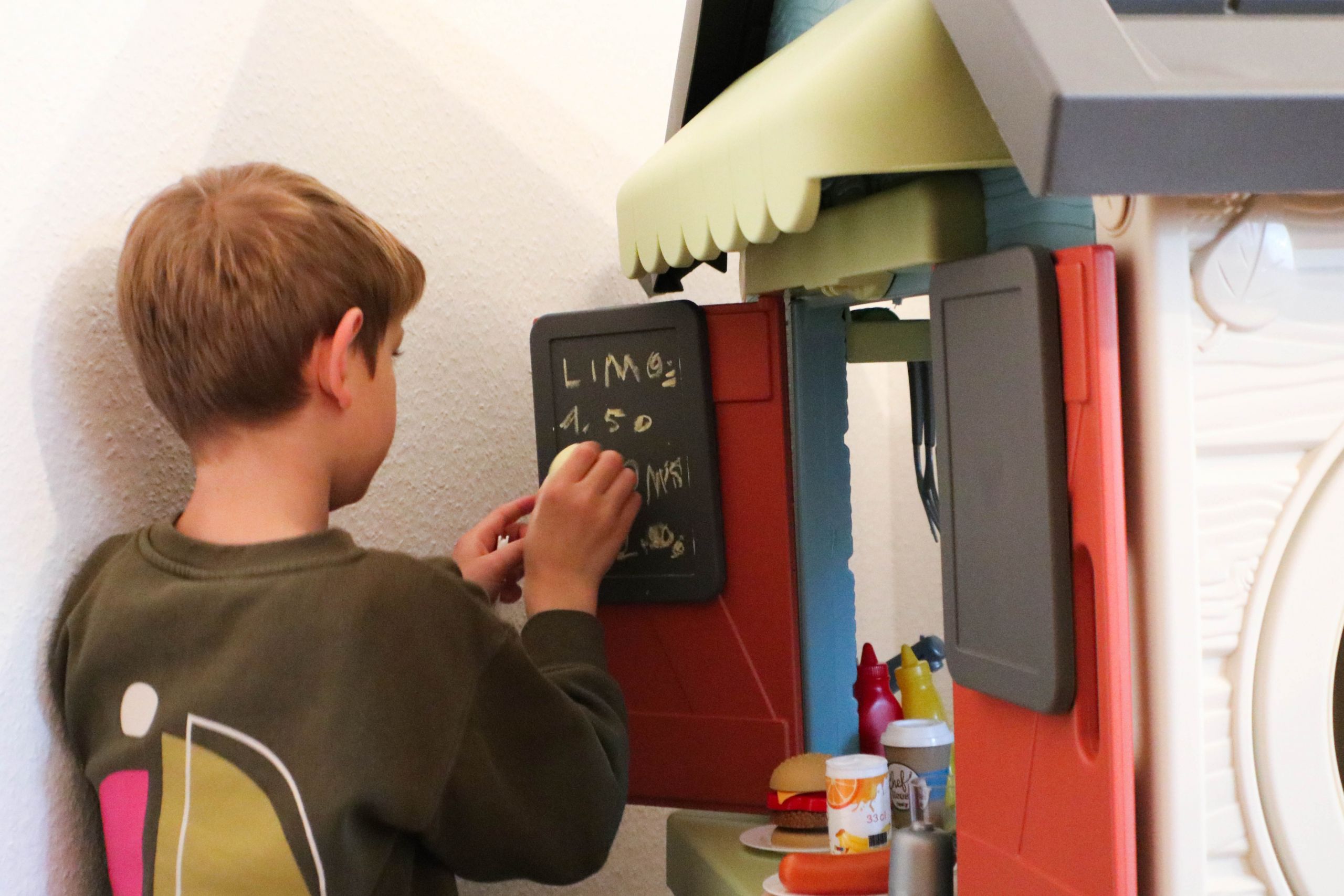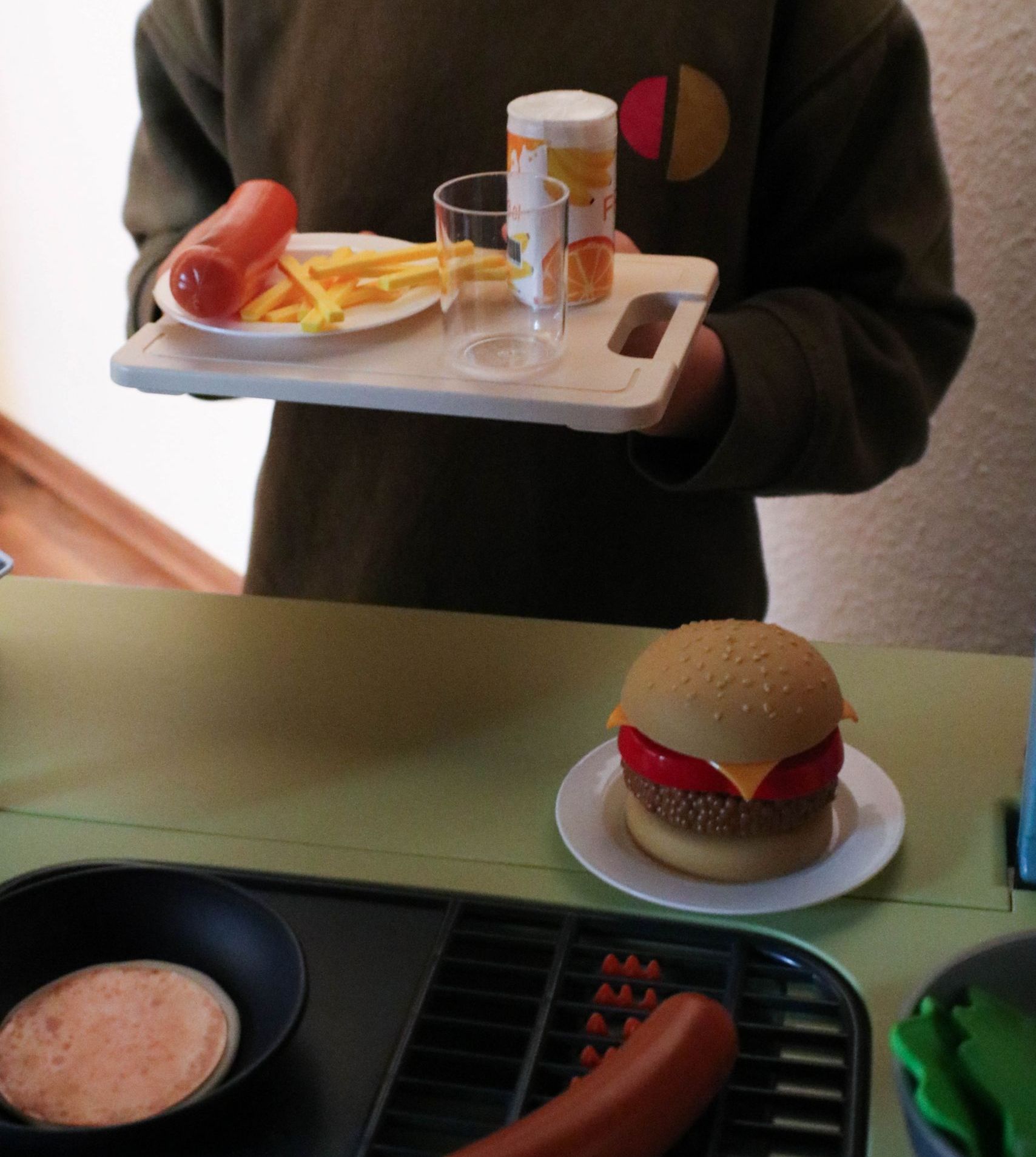 Der Große durfte das Haus ja bereits ausprobieren. Obwohl er von der Körpergröße etwas zu groß für das Haus ist, hat das seinen Spielspaß überhaupt nicht geschmälert. Er hat den Herd ausprobiert, die EC-Karte verwendet, seine eigene kleine „Küche“ organisiert und seine Kunden (also mich) „bedient“. Und ich darf Stammgast sein. Ein wirklich hartnäckiger und teilweise unangenehmer Stammgast, aber die Jungs wollen es ‚real‘. Also gebe ich alles, was die Theater-AG damals in mir hervorgeholt hat. Die Begeisterung war sofort spürbar, die Daumen gingen hoch und ich hatte am Ende ungefähr um die 300 Bestellungen zu verspeisen.