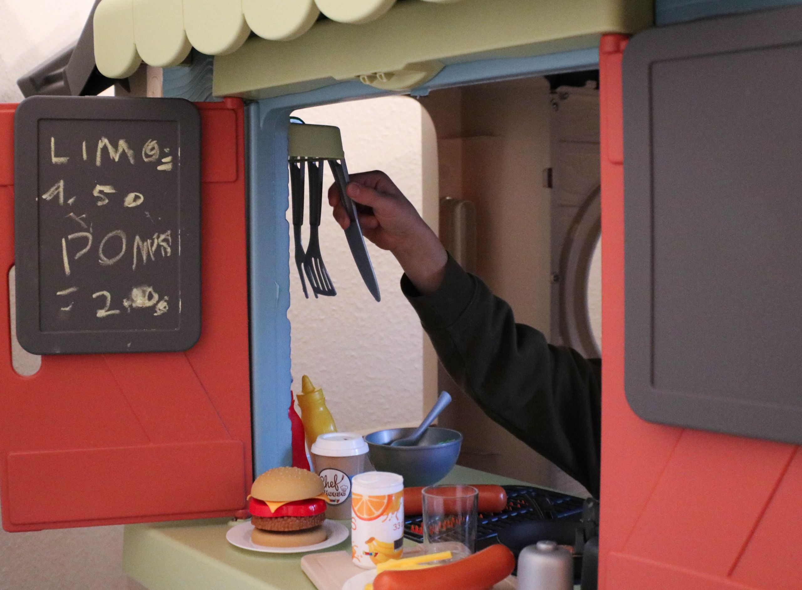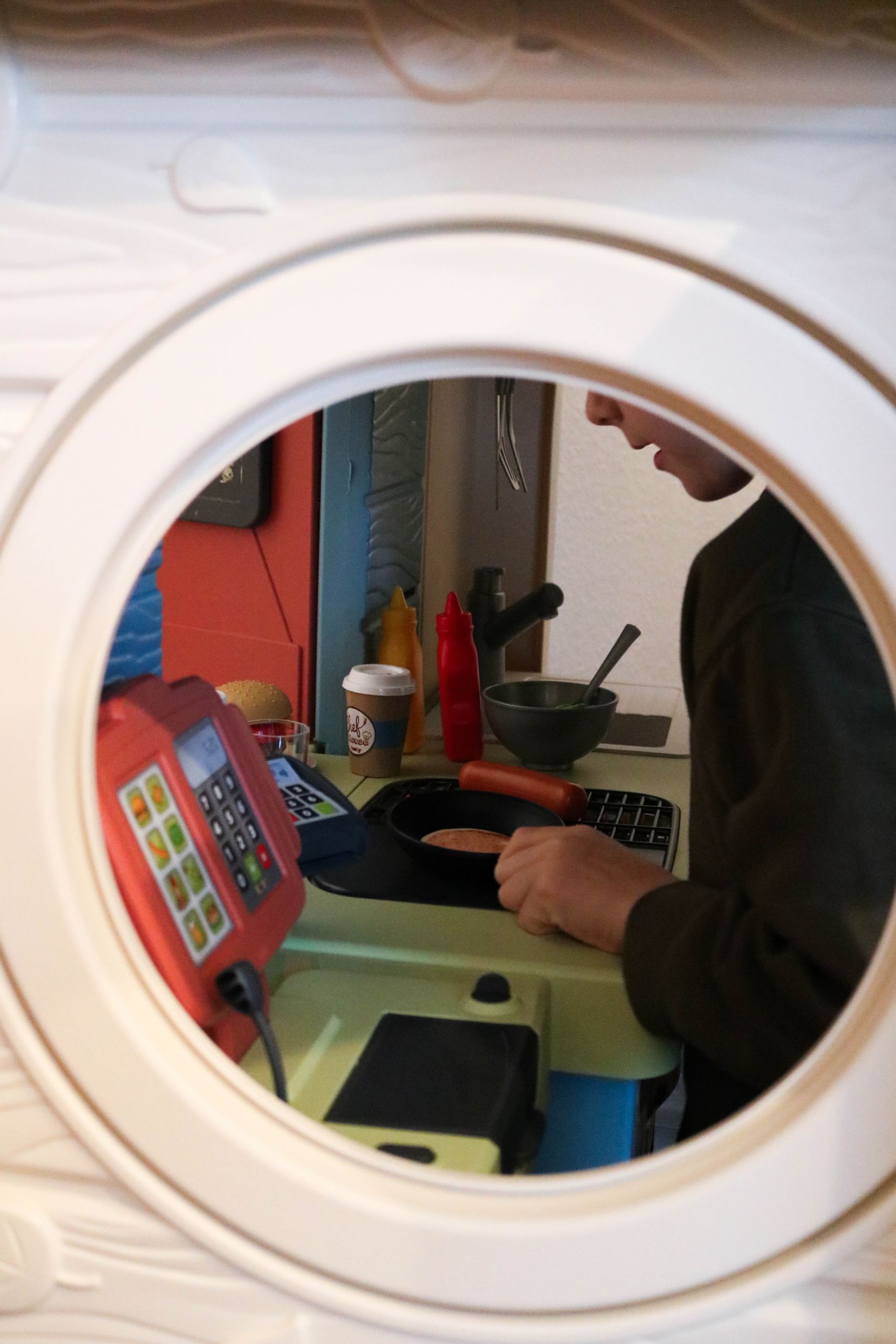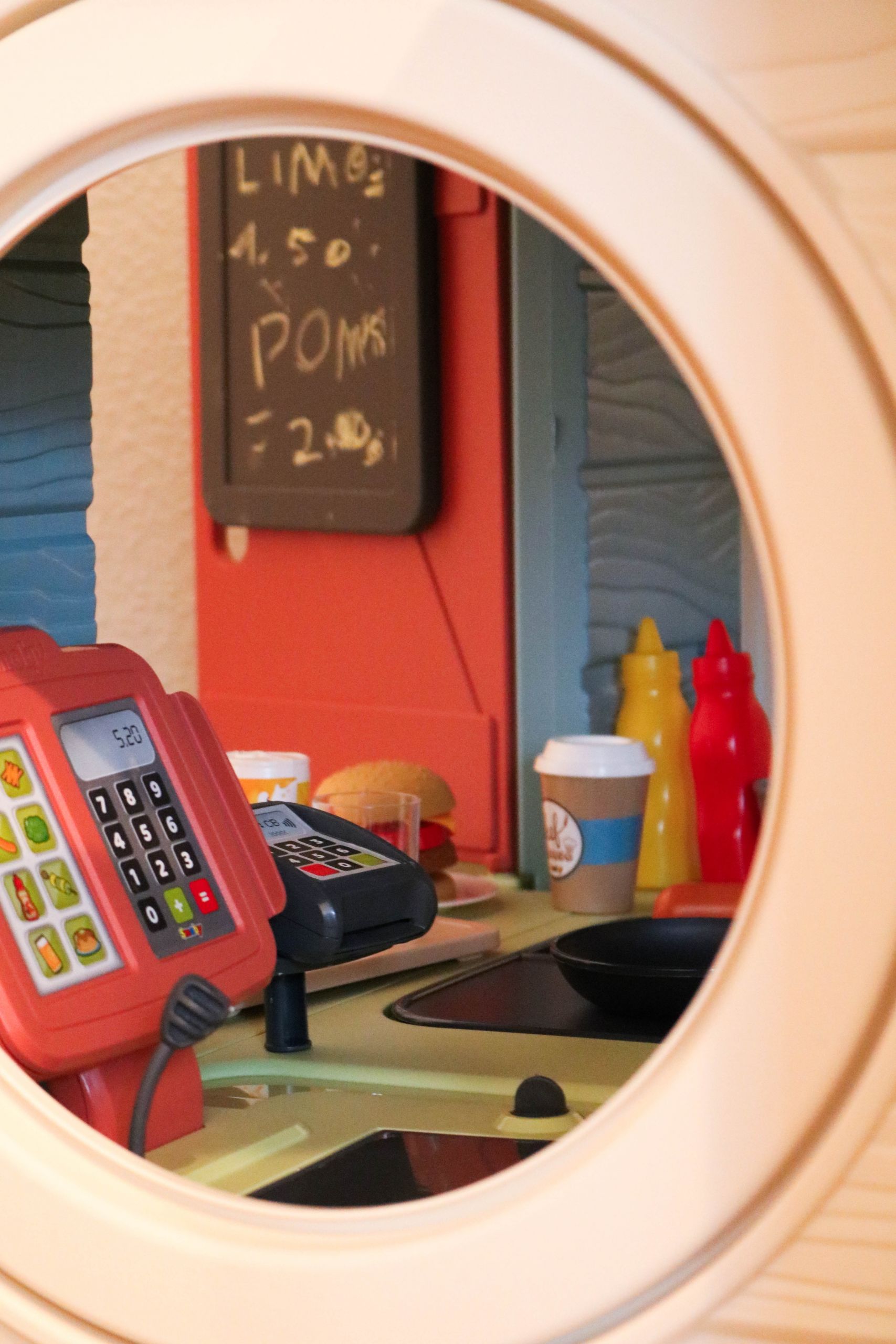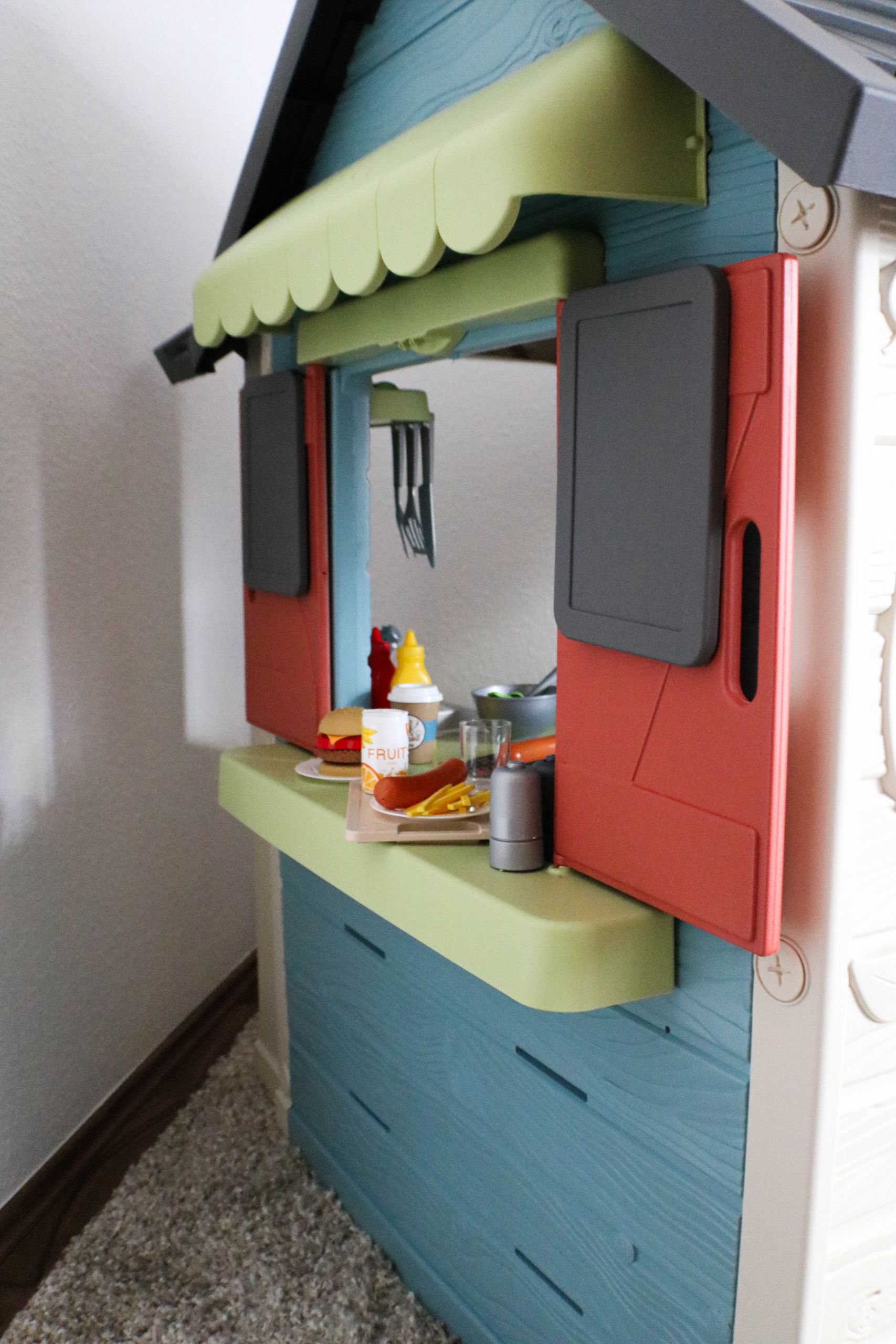 - Bedienungs- und Imbissbereich: Das Haus ist als kleiner Imbiss konzipiert. Kinder können ihre „Kunden“ bedienen, Menüs erstellen und Bestellungen aufnehmen. Das fördert Teamwork, Rollenspiel und soziale Interaktion und das alles in einer sicheren, kindgerechten Umgebung. Es gibt sogar eine kleine Theke mit Durchreiche, an der die Gäste (also Mama und Oma) ihre Bestellungen aufgeben können.